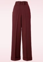 Diese 40s Hidden Away Trousers ist inspiriert an den Hosen die von progressiven Damen getragen wurden in den 40s und 50s! Der hohe Taillenbund formt einen schönen Kontrast zu den weiten Hosenbeinen und wirkt sehr schmeichelnd. Auch bei einem volleren Po oder einer breiteren Hüfte wirkt man in dieser Hose schön schlank. Die schwarze Schleife auf der Vorderseite und das Knopfdetail auf der Rückseite ergänzen diese Hose auf hübsche Weise. Hergestellt aus einem weichfließenden, leicht dehnbaren Stoff in Burgund, mit einem schicken Umschlag am Hosenbein. Kombiniere die Hose mit einer Bluse und Pumps für den perfekten Business-Look im retro Stil!   * Weites Hosenbein * Abtrennbare Schleife auf der Vorderseite * Seitliche Taschen * Verdeckter Reißverschluss an der Seite * Die Hosenbeine können leicht gekürzt werden * Unsere „Stunning Redhead“ Vanessa Frankenstein ist 1.67m