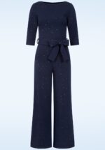 Ein echtes Power-Outfit mit Glitzer! Der Jumpsuit Irina hat einen eleganten U-Boot-Ausschnitt, ¾-Ärmel und lange, weite Hosenbeine. Er ist aus einem festen, aber dennoch weichen und elastischen, crêpe-ähnlichen Stoff in Marineblau gefertigt, der für eine wunderbar bequeme Passform sorgt und mit funkelnden Glitzersteinen besetzt ist. * ¾-Ärmel * U-Boot-Ausschnitt * Abnehmbarer Bindegürtel * Verdeckter Reißverschluss hinten * Lange, weite Hosenbeine