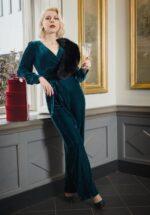 Es wird Zeit für einen unvergesslichen Auftritt! Für diese Saison haben sich unsere Inhouse-Designer von Ava Gardners legendärem Stil im Film „Die barfüßige Gräfin“ inspirieren lassen. Das Modell Celeste ist aus einem hochwertigen, blaugrünen Stoff mit Stretchanteil gefertigt, der herrlich angenehm zu tragen ist und durch seine edle Samtoptik besticht. Wenn du diesen Jumpsuit trägst, wirst du zur begehrten Diva! * Oberteil mit V-Ausschnitt und Wickeloptik * Lange Puffärmel mit Manschetten * BH-Trägerhalter, damit deine Träger nicht verrutschen * Gefüttertes Oberteil * Abnehmbarer Bindegürtel für eine besonders betonte Taille * Lange weite Hosenbeine * Verdeckter Reißverschluss hinten * Stella Rose Cherry ist 1,71 m groß. Sie trägt ihre eigenen Pumps. * Marjolein ist 1,82 m groß