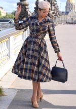 Zeitloser Charme trifft auf wohlige Eleganz: Eden Lee macht den Herbst perfekt! Dieses langärmelige Mantelkleid im Vintage-Look hält dich wunderbar warm. Es hat einen klassischen Reverskragen und einen abnehmbaren Gürtel, der deine Taille betont und eine elegante Silhouette zaubert. Das Modell ist aus weichem, geschmeidigem Baumwollflanell gefertigt, der durch ein Schottenkaro in Marineblau, Beige und Orange besticht. Das mit Satin gefütterte Oberteil sorgt für ein luxuriöses Tragegefühl. * Mantelkleid * Gefüttertes Oberteil * Reverskragen * Lange Ärmel * Knopfleiste vorne * Abnehmbarer Gürtel für eine besonders betonte Taille * Mit Taschen! * Endet bei einer Körpergröße von 1,70 m unterhalb des Knies