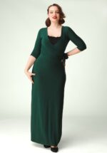 Ein waldgrüner Traum im Maxi-Format! Wenn du Annika trägst, wirst du dich rundum fantastisch fühlen. Das Modell besticht durch ein wunderschön gerafftes Wickeloberteil mit sexy V-Ausschnitt und eleganter Schleife im Taillenbereich. Von der Taille abwärts fällt es als fließender Maxirock. Das Kleid ist aus einem anschmiegsamen, elastischen und glatten Stoff gefertigt, der leicht glänzt, nicht knittert und herrlich angenehm zu tragen ist.   * Langes Maxikleid * Gefüttertes Oberteil * Gekreuzter Ausschnitt mit Raffung * ¾-Ärmel * Fest vernähte Schleifenbänder im Taillenbereich * Kein Reißverschluss, keine Knöpfe: einfach überziehen und los geht’s! * Endet bei einer Körpergröße von 1,70 m am Knöchel * Exklusiv bei Topvintage erhältlich