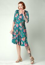 Fühl dich rundum weiblich in diesem Aria Floral Swingkleid! Gefertigt aus einem geschmeidigen und dehnbaren, leicht glänzenden Slinky Stoff in Smaragdgrün, der ein wunderschönes Blumenmuster in Herbstfarben zeigt – es ist federleicht und verknittert nicht.   * Semi-Swing Modell * V-Ausschnitt * Feste gefütterte Wickeloptik  * 3/4 Ärmel * Plissierter Taillenbund mit fester Schleife * Kein Reißverschluss oder Knopf; anziehen & ‚ready to go‘! * Fällt bei einer Größe von 1,70 m über das Knie * Exklusiv bei Topvintage erhältlich * Melissa ist 1.78m groß