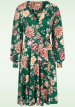 Dieses wunderschöne Kleid hebt die Stimmung! Das Modell besticht durch seinen eleganten V-Ausschnitt mit fest vernähtem Wickel-Detail und lange Puffärmel, die einen charmanten, femininen Look kreieren. Die abnehmbare Schleife setzt deine Taille gekonnt in Szene, während der fließende, ausgestellte Rock mit Wickeloptik bei jedem Schritt anmutig mitschwingt. Das Kleid ist aus einem leicht glänzenden und anschmiegsamen Stoff in Smaragdgrün gefertigt, der durch einen tollen Print mit bunten Blumen besticht.   * Semi-Swing-Modell * V-Ausschnitt mit Wickeloptik * Gefüttertes Oberteil * Lange Puffärmel mit Manschetten  * Fest vernähte Schleife im Taillenbereich * Kein Reißverschluss, keine Knöpfe: einfach reinschlüpfen und los geht’s! * Endet bei einer Körpergröße von 1,70 m weit unterhalb des Knies * Exklusiv bei Topvintage erhältlich