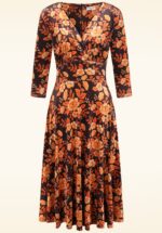 Orangefarbene Blüten, schwarzer Samt und Herbststimmung pur! Dieses vom Vintage-Stil inspirierte Kleid mit ¾-Ärmeln besteht aus einem eleganten Oberteil in Wickeloptik mit leichter Raffung, einem breiten Bund und einem weich fallenden Swingrock, der eine besonders feminine Silhouette zaubert. Es ist aus einem festen, elastischen schwarzen Mischgewebe gefertigt, das wie Samt wirkt, und besticht durch einen orangefarbenen Blumenprint. * Swing-Style * Gefüttertes Oberteil in Wickeloptik * V-Ausschnitt mit Raffung * ¾-Ärmel * Verdeckter Reißverschluss auf der Rückseite * Endet bei einer Körpergröße von 1,70 m unterhalb des Knies * Exklusiv bei Topvintage erhältlich