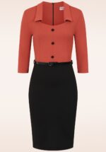Schwarz und Orange: natürliche Eleganz und ein souveräner Auftritt. Das Modell ist aus einem festen und zugleich dehnbaren Material gefertigt, das an Kreppstoff erinnert. Eine tolle Kombination aus Schwarz und Dunkelorange, die deine Kurven wunderschön in Szene setzt.     * Figurbetonter Schnitt * Gefüttertes Oberteil * ¾-Ärmel * Ausschnitt mit Kragen und Zierknöpfen * Abnehmbarer Lackgürtel, der die Taille zusätzlich betont * Verdeckter Reißverschluss hinten * Endet bei einer Körpergröße von 1,70 m unterhalb des Knies * Exklusiv bei Topvintage erhältlich