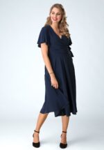 Wie schön ist dieses Irene Kleid?! Es hat ein festes Wickeltop, kurze Schmetterlingsärmel und einen plissierten, schmeichelhaften Taillenbund und wurde aus einem glatten und geschmeidigen, leicht glänzenden, dehnbaren Slinky Stoff in Marineblau gefertigt. Federleicht und garantiert knitterfrei trägt es sich herrlich. Irene ist Liebe, pure Kleid-Liebe!   * Semi-Swing Modell * Gefüttertes Top für den Extra-Komfort  * Feste Wickeloptik  * Kurze Schmetterlingsärmel * Plissierter Bund an der Taille * Feste Bindebänder * Kein Reißverschluss oder Knopf; anziehen & ‚ready to go‘! * Fällt bei einer Größe von 1,70 m weit über das Knie * Exklusiv bei Topvintage erhältlich * Melissa ist 1.78m groß