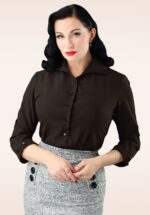 “Life needs a few more polka dots!“ Dieses Schätzchen hat einen umgeschlagenen Kragen mit festen Bindebändern, lange Ärmel und tolle goldfarbene Knöpfe mit schwarzem Samt. Gefertigt aus einer festen, aber angenehmen und dehnbaren Stoff in Creme, verziert mit schwarzen Polka Dots. * Kürzeres Modell * Umgeschlagener Kragen mit festen Bindebändern * Lange Armel * Goldfarbene Knöpfereihe mit Samt Finish