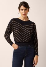 Dezenter Schimmer, endlose Eleganz! Dieses Strickoberteil strahlt zeitlosen Chic mit einem Hauch von 70er-Jahre-Glamour aus. Es hat eine lockere Passform und elegante Dolman-Ärmel, die für eine lässig-elegante Silhouette sorgen. Das Streifenmuster mit goldfarbenen Glitzerfäden setzt funkelnde Akzente. Das Modell ist aus einem weichen, fein gestrickten Baumwollmischgewebe mit einem Hauch von Kaschmir gefertigt, das sich luxuriös anfühlt und herrlich angenehm zu tragen ist. * Lockere Passform * Hoher Rundhalsausschnitt * Dolman-Ärmel * Mit eingewebten Glitzerfäden * Knopf auf der Rückseite * Elastische Rippbündchen