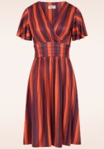 Ein Traum von Vintage und perfekt für jeden Anlass! Sadie bezaubert mit kurzen Schmetterlingsärmeln und einem Oberteil in Wickeloptik, das ab der Taille in einen fließenden Semi-Swingrock übergeht. Das Kleid ist aus einem glatten, geschmeidigen und knitterfreien Stretchstoff gefertigt, der sich angenehm trägt und mit einem Streifenmuster in dunklen Herbsttönen verziert ist. Komplimente und bewundernde Blicke garantiert! * Semi-Swing-Style * Gefüttertes Oberteil * Wickeloptik * Kurze Schmetterlingsärmel * Plissierter Bund * Kein Reißverschluss, keine Knöpfe: einfach reinschlüpfen und los geht’s! * Endet bei einer Körpergröße von 1,70 m unterhalb des Knies * Exklusiv bei Topvintage erhältlich