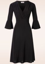 Flirte den ganzen Tag in diesem 40s Irene Cross Over Swing Dress in Black! Du spürt es sobald du dieses Kleid anziehst; es ist einfach perfekt! Dieses hübsche Kleid wird dich, mit dem wundervollen figurbetonten Top in Wickeloptik mit einer sexy V-Halslinie und den verspielten Bindeschleifen, die du sowohl lose als auch zusammengebunden tragen kannst, und den schmeichelnden Seitenraffungen, ein super weibliches Gefühl geben. Die schwungvollen Flügelärmeln verleihen einen verspielten Akzent und der semi-swing Rock ergibt eine elegante Ausstrahlung, wow! Aus einem glatten, fließenden, leicht glänzenden, schwarzen Stoff mit einem Stretch-Anteil der viel Tragekomfort garantiert und knitterfrei ist. Irene ist Liebe, die Liebe zu einem hübschen Kleid! * Semi-swing Modell * V-Halslinie * Wickeloptik * Kurze Ärmel * Feste Bindebänder * Gefüttertes Top * Schlupfkleid * Unsere hübsche Blondine Rachel ist 1.72m groß