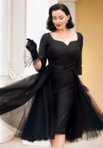 Es wird Zeit, den roten Teppich auszurollen! In dieser Saison haben sich unsere talentierten Inhouse-Designer unter anderem von dem Motto „Opulenz steht dir gut“ inspirieren lassen. Manchmal muss es einfach mehr sein! Genau dafür steht dieses vielseitige, partytaugliche Bleistiftkleid, das sich ganz nach Belieben besonders ausdrucksstark oder eher dezent stylen lässt. Das Modell hat einen abnehmbaren Überrock aus mehreren Lagen Tüll, der an der Taille befestigt wird und einen völlig anderen Look zaubert! Das Kleid ist aus einem festen, hochwertigen schwarzen Stoff gefertigt, der leicht glitzert, für eine vorteilhafte Passform sorgt und dich zum Star des Abends macht. Bist du bereit für den roten Teppich? * Figurbetonter Schnitt * Gefüttertes Oberteil * V-Öffnung am Ausschnitt * Ellenbogenlange Ärmel * BH-Trägerhalter, damit deine Träger nicht verrutschen * Schlitz hinten * Verdeckter Reißverschluss hinten * Abnehmbarer Überrock aus Tüll (mit Schleifendetail und Druckknöpfen) * Die wunderschöne Stella Rose Cherry ist 1,71 m groß. Sie trägt ihre eigenen Vintage-Schätze und Pumps als Accessoires.