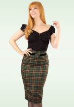 Dieser 50s Bliss Tartan Pencil Skirt in Green ist ein traumhafter Rock in einem wundervollen Karomuster! In diesem pfiffigen Bleistiftrock wirst du nicht unbeobachtet bleiben, vavavoom! Hübsches, taillenhohes Modell mit verspielten Details, wie zum Beispiel die kontrastierenden Blenden aus schwarzem Samt an den Taschen und am Taillenbund. Hergestellt aus einem dunkelgrünen Baumwolle-Mix der deine Kurven wundervoll betonen wird, ohne aufzutragen und gefüttert mit einem grünen Stoff. Aber erst das auffällige Karomuster in Rot, Gelb und Schwarz macht aus diesem Rock einen echten Retro-Klassiker. Lieben wir nicht alle diesen „Karo-Stauner“?! * Bleistiftrock * Taschen * Verdeckter Reißverschluss auf der Rückseite * Gehschlitz auf der Rückseite * Unser hübsches, rothaariges Model, Vanessa Frankenstein, ist 1.67m groß