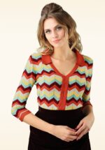 „Feel the sixties Vibe“ mit diesem Zoe Zig Zag Collar Top in Earth and Aqua! Schlicht aber trotzdem besonders dank des wundervollen Zick-Zack-Musters! Dieses Top hat eine schöne V-Halslinie mit verspieltem Kragen und und 3/4 Ärmeln, total süß! Hergestellt aus einem herrlich weichen und dehnbaren Viskose-Mix mit einem Zick-Zack-Muster in Orangebraun, Gelb und Blautönen, der seine schöne Passform behalten wird, auch nach mehrfachem Waschen. Ein vielseitiges und klassisches Top das nicht fehlen darf in dem Kleiderschrank einer echten retro Lady 😉 * V-Halslinie * Kragen * 3/4 Ärmel * Die Länge ist ausreichend um es zu einer Hüfthose zu tragen