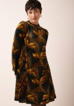 Ein Traum aus Samt! Dieses schwarze Kleid ist aus einem etwas dickeren, wunderbar samtigen und elastischen EcoVero-Viskosemix gefertigt und besticht durch ein Retro-Muster in warmen Brauntönen. * Hoher Rundhalsausschnitt * Schlüsselloch-Detail mit Knopf auf der Rückseite * Lange Puffärmel * Endet bei einer Körpergröße von 1,70 m knapp über dem Knie