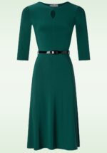 Lieblingskleid immer! – Martha zeigt elegante 3/4 Ärmel und eine hohe Halslinie mit einem Keyhole-Detail. Ab der Taille entfaltet sich ein schöner Semi-Swing Rock, der jeder Figur zu schmeicheln weiß. Gefertigt aus einem angenehmen und dehnbaren Slinky Stoff in Waldgrün, versehen mit einem abnehmbaren schwarzen Lackgürtel. * Semi-Swing Modell * Gefüttertes Oberteil * Keyhole vorne * 3/4 Ärmel * Abnehmbarer Lackgürtel * Kein Reißverschluss oder Knopf; anziehen & ‚ready to go‘! * Fällt etwas über das Knie bei einer Größe von 1.70 m