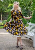 „Wearing this floral dress is like being hugged by a garden, minus the thorns!“ 😉 Gefertigt aus einem angenehmen und dehnbaren, schwarzen Baumwollmix, der sich herrlich trägt und mit großartigen Blumen in Gelbtönen und einem Hauch an Blau verziert wurde und sich herrlich trägt.     * Swing Kleid * Spitzer Kragen * Versehen mit Zierknöpfen * 3/4 Ärmel * ‚It has pockets!‘ * Verdeckter Reißverschluss hinten * Kombinierbar mit einem Petticoat für einen besonders festlichen Effekt * Fällt bei einer Größe von 1,70 m über das Knie