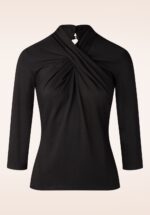Dieses 50s Sophia Evening Jersey Top in Black hat das Zeug um dein neues Lieblingstop zu werden! Dieses schöne Top hat eine hohe Halslinie mit einem schmalen Stehkragen, ein elegantes Wickel-Detail und ¾ Ärmel. Hergestellt aus geschmeidiger, schwarzer Baumwolle die herrlich dehnbar ist und eine schöne Passform ergibt. Pfiffig oder doch lieber klassisch? Die schöne Sophia macht alles mit! 😉 * Hohe Halslinie mit schmaler Stehkragen * ¾ Ärmel * Schlüsselloch-Detail mit Knopfverschluss auf der Rückseite * Ausreichend lang, du kannst es zu einer Hüfthose tragen