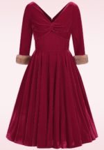 Dieses hinreißende Swingkleid aus Samt ist der Inbegriff von Old-School-Glamour! Es hat einen eleganten V-Ausschnitt mit einem raffinierten gedrehten Detail, das deine Silhouette wunderschön betont. Dank der ellbogenlangen Ärmel mit abnehmbarem Kunstfellbesatz strahlt dieses Modell Hollywood-Flair aus und eignet sich perfekt für festliche Anlässe. Es ist aus einem weichen und dehnbaren, samtigen Mischgewebe in einem satten Rotton gefertigt, das sich herrlich angenehm anfühlt und alle Augen auf sich zieht. * Swingkleid * V-Ausschnitt mit gedrehtem Detail * Ellbogenlange Ärmel mit abnehmbarem Kunstfellbesatz * Reißverschluss mit Haken auf der Rückseite * Endet bei einer Körpergröße von 1,70 m unterhalb des Knies